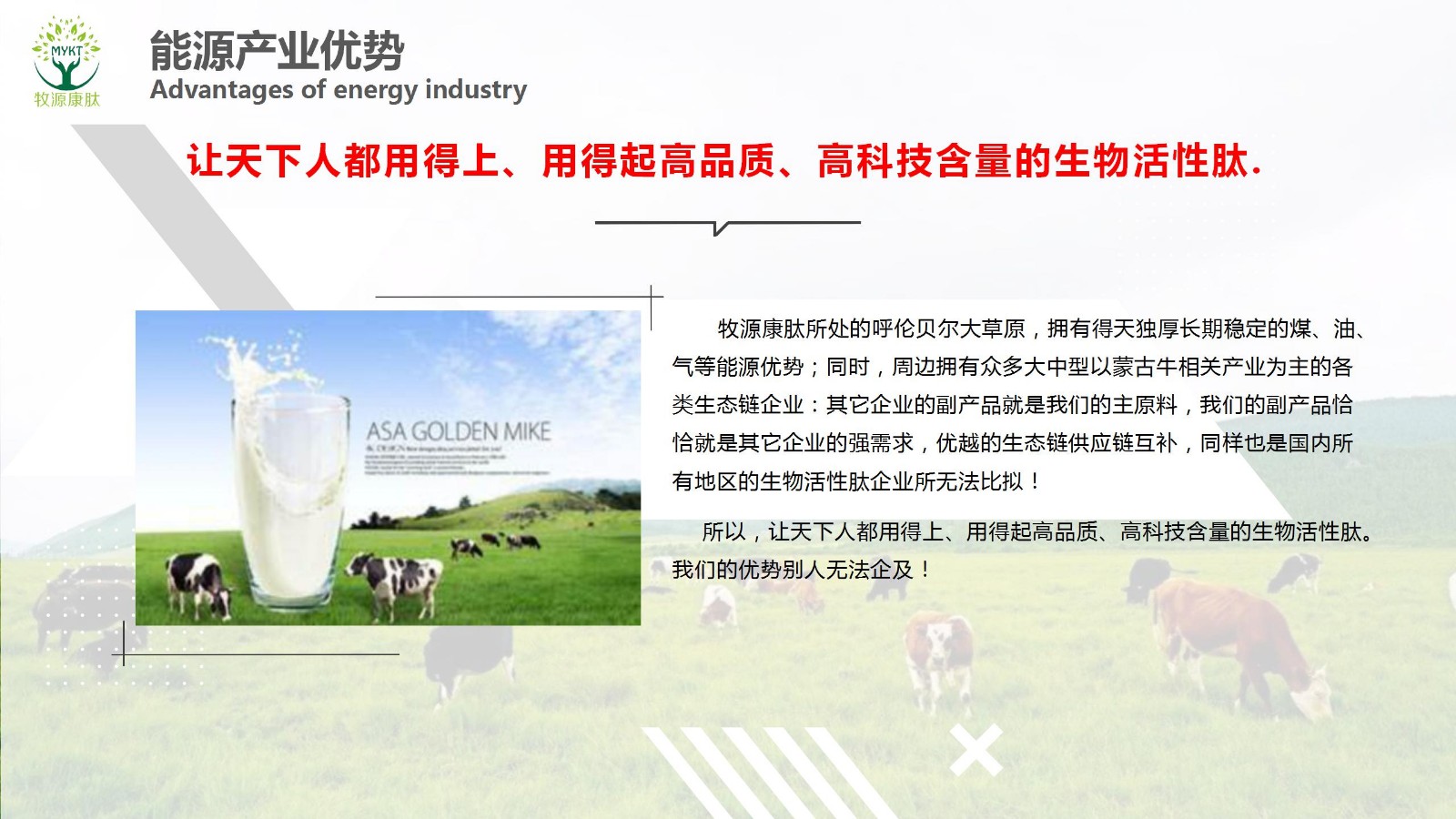 摘要:讓天下人都用得上、用得起高品質(zhì)、高科技含量的生物活性肽.牧源康肽所處的呼倫貝爾大草原,擁有得天獨(dú)厚長(zhǎng)期穩(wěn)定的煤、油、氣等能源優(yōu)勢(shì);同時(shí),周邊擁有眾多大中型以蒙古牛相關(guān)產(chǎn)業(yè)為主的各類(lèi)生態(tài)鏈企業(yè):其它企業(yè)的副產(chǎn)品就是我們的主原料,我們的副產(chǎn)品恰...